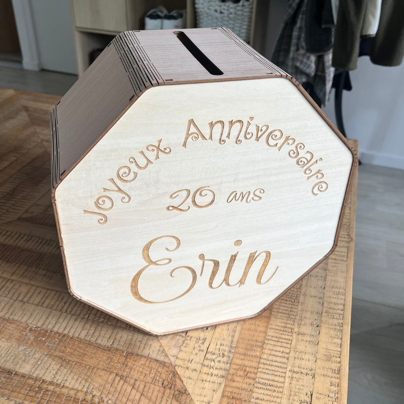 Entièrement personnalisable, cette boîte est gravée sur mesure selon votre thème, vos prénoms, une date, un message ou un motif spécifique.